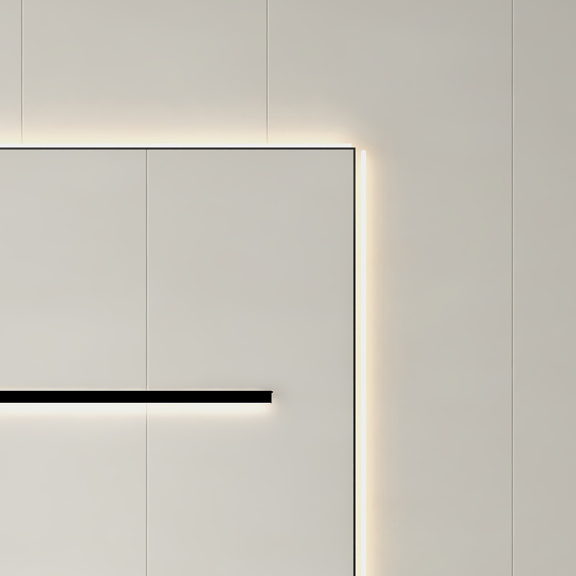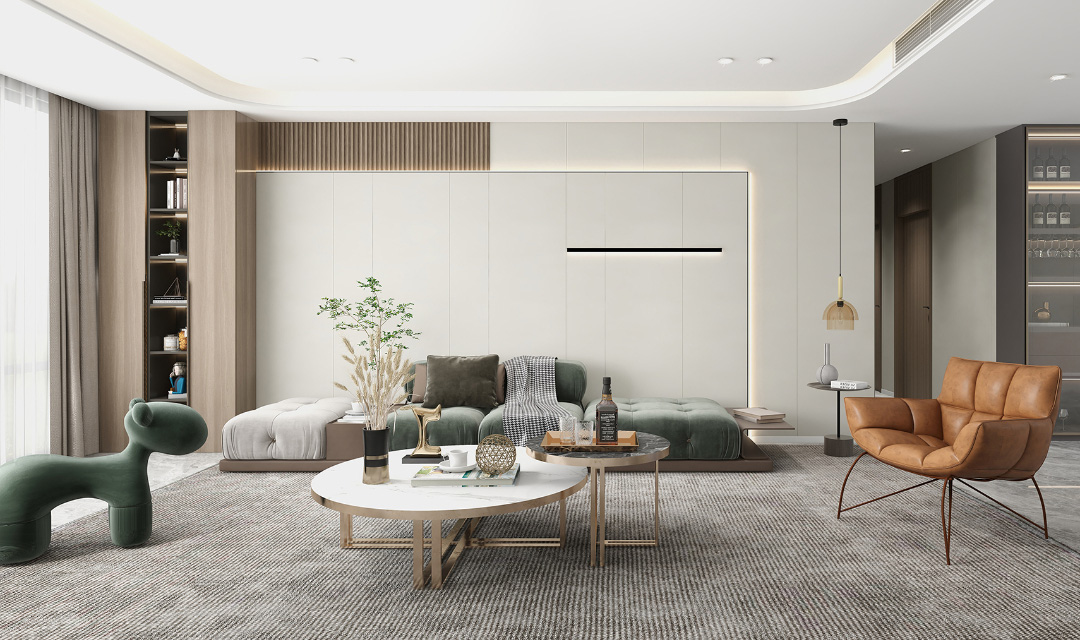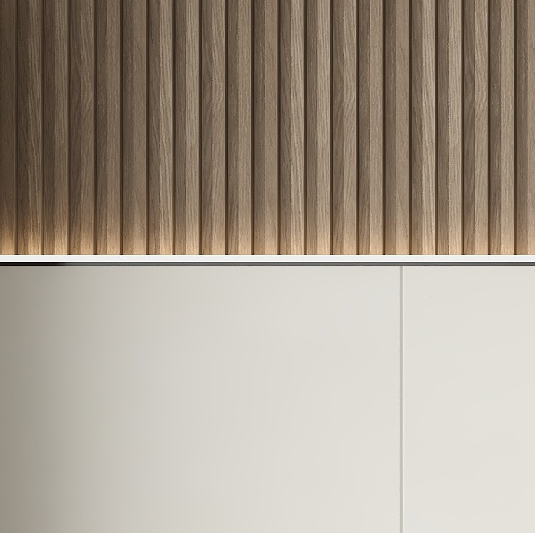 客厅,作为家的第一张名片,是心灵休憩的温柔港湾。沙发背景墙以墙柜一体化的前瞻设计,将实用与美学完美融合。格栅板与平板的精心交织,仿佛大自然的韵律在墙面上轻盈跳跃,再叠加一层墙板,更是将这份层次与立体推向极致,让每一寸空间都散发着艺术的气息。
