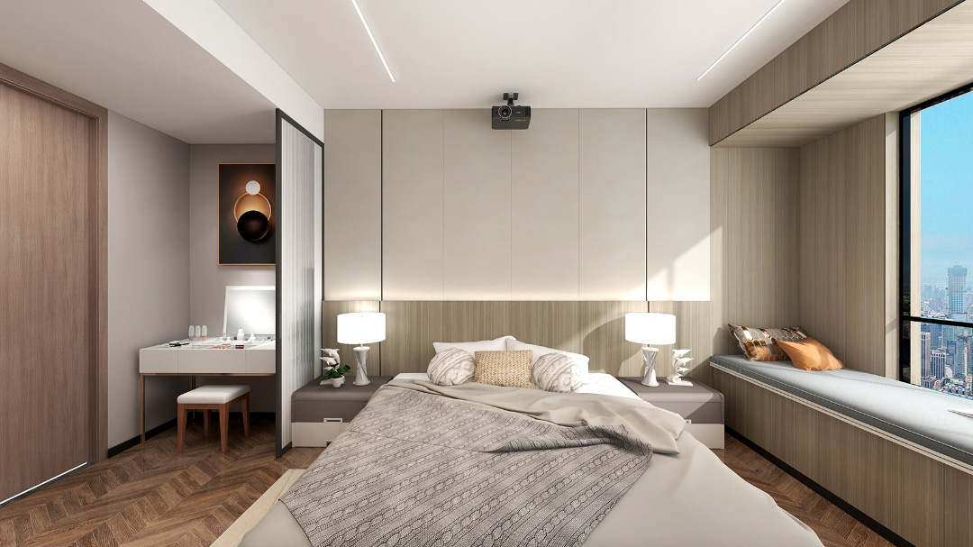 步入卧室,浅灰色与木色的搭配,既沉稳又不失自然韵味。