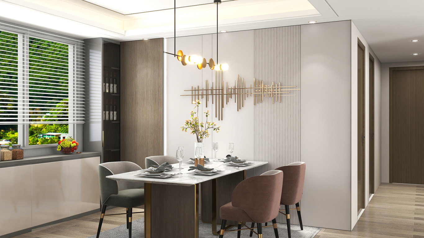 格栅板与平板的交织背景墙,轻奢风的金属挂饰,窗台柜与餐边酒柜的巧妙融合,既满足了储物需求,又让餐厅的空间布局更加合理有序。
